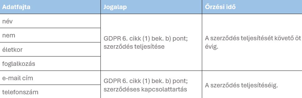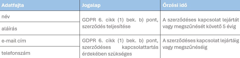 Adatkezelés célja: Szerződéskötés és kapcsolattartás