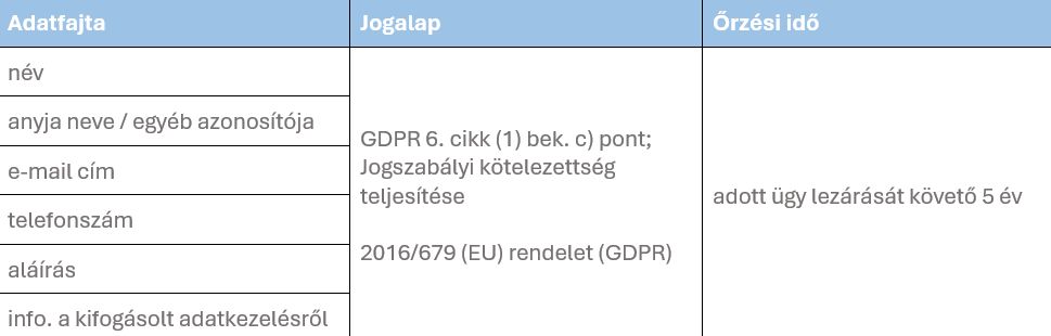 Adatkezelés célja: Azonosítás, az eljárás lefolytatása és kapcsolattartás