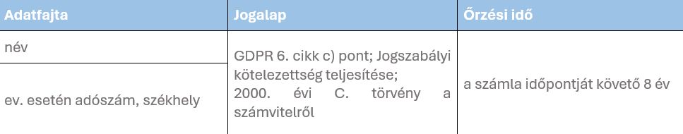 Adatkezelés célja: Számviteli törvény szerinti bizonylat-kezelés