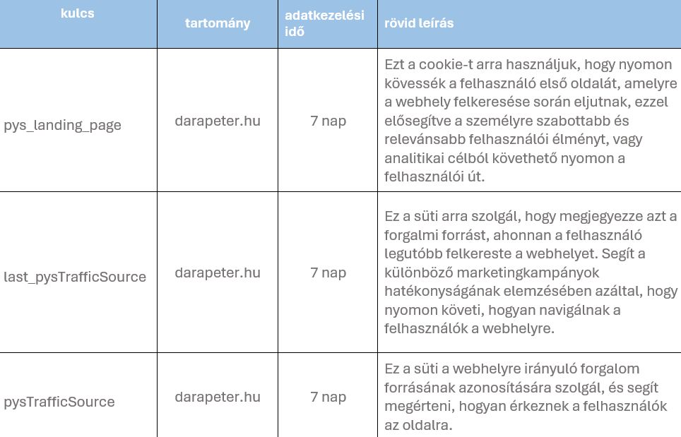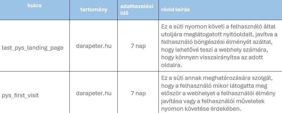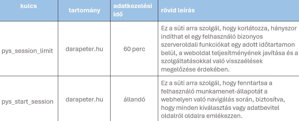 pys_session_limit darapeter.hu 60 perc Ez a süti arra szolgál, hogy korlátozza, hányszor indíthat el egy felhasználó bizonyos szerveroldali funkciókat egy adott időtartamon belül, a weboldal teljesítményének javítása és a szolgáltatásokkal való visszaélések megelőzése érdekében.